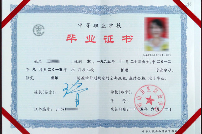 眉山卫生职业学校毕业证书样本