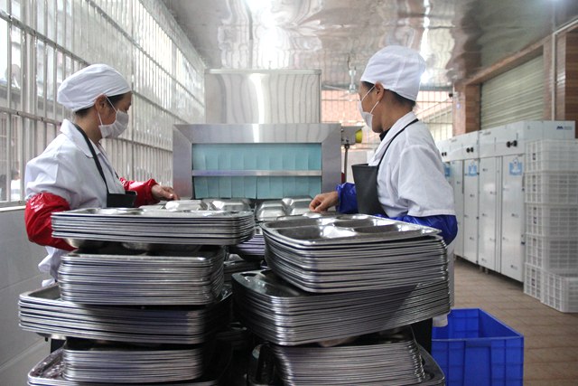 工作人员再将已消毒的餐盘