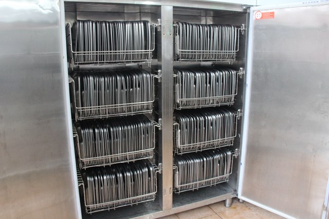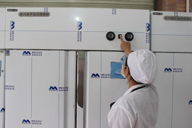 所有餐盘放进“热风循环消毒柜”